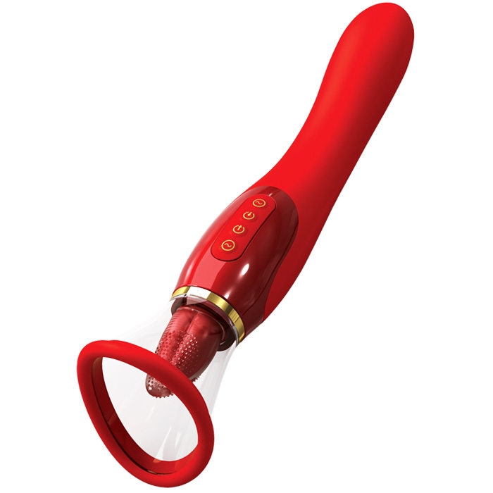 Универсальный вибромассажер ярко-красного цвета с золотой каёмкой, объединяющий в себе и вибратор и вакуумную помпу с клиторальный стимулятором-язычком для имитации оральных ласк. Четыре мощных моторчика внутри обеспечивают игрушку 3 режимами всасывания, 7 моделями движения язычка и 10 программами вибрации. Для ценителей шика. Совершенство во всех отношениях!